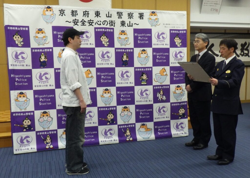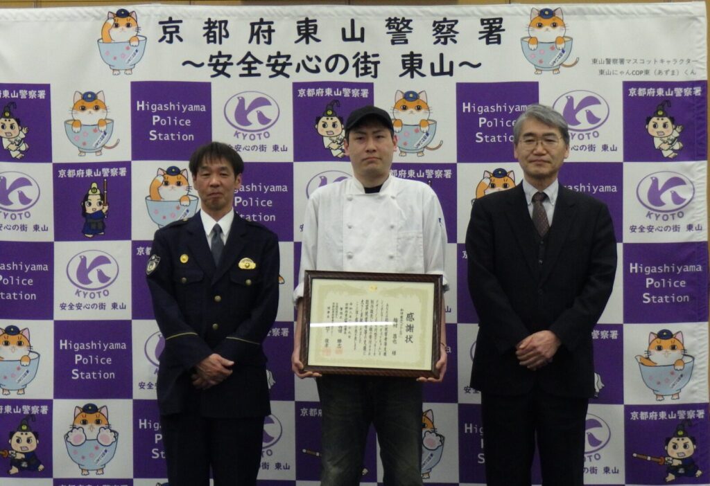 1月19日、舞鶴市の和洋菓子フクムラ店主 福村昌也様に、当センター理事長および京都府東山警察署長の連名で感謝状を贈呈しました。